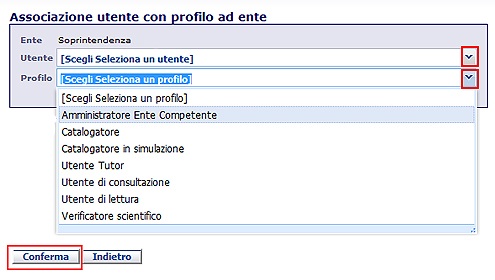 Si effettua nel momento in cui l’utente ha necessità di un profilo specifico per svolgere determinate funzioni all’interno di SIGECweb. I profili disponibili per un ente dipendono dalla tipologia di ente e dalle funzionalità disponibili per l’ente stesso. La funzione di associazione di un utente ad un ente non riguarda i profili di catalogatore e verificatore, anche se questi sono presenti nel menù a tendina dei profili associabili quando un utente viene associato ad un ente, pertanto non bisogna procedere all’associazione di catalogatori o verificatori scientifici ad un ente, nonostante il sistema lo consenta. Catalogatori e verificatori scientifici potranno invece essere associati alle attività di catalogazione e potranno ricevere un numero illimitato di incarichi di catalogazione anche all’interno dello stesso ente.